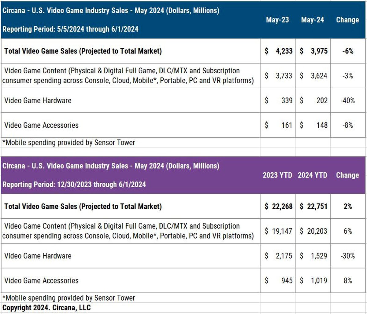 Общий объем рынка в мае оценивается в $3.975 миллиарда против $4.233 миллиарда годом ранее. Сильнее всего просели продажи консолей: падение по сравнению с маем 2023 года составило сразу 40%.