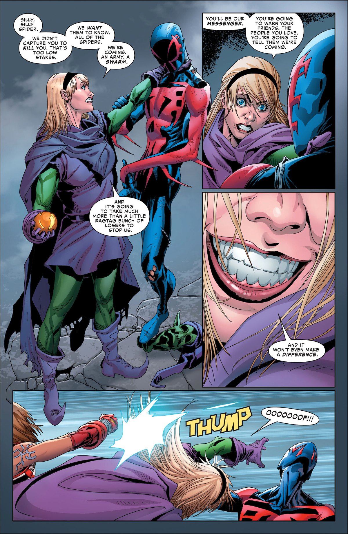 А ещё выходил одиночный комикс Web of Spider-Man. Из него стал известен предводитель общих антагонистов - ставшая Зелёным гоблином Гвен Стейси. Поведёт она целую армию, даже стаю, под названием Зловещий эскадрон. Судя по всему, состоит это войско из особых версий паучьих врагов.