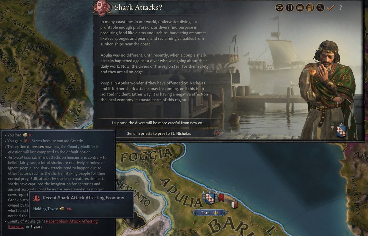 Но бывает и другое. В одном графстве ныряльщики постоянно доставали из воды жемчуг, устриц и прочие полезные вещи. А теперь стая акул нападает, что людей пугает. Это нанесёт ущерб экономике - налоговые сборы понизятся на 3% с территории. Можно потратить несколько монет, чтобы священник помолился святому по этому поводу. Вдруг поможет.