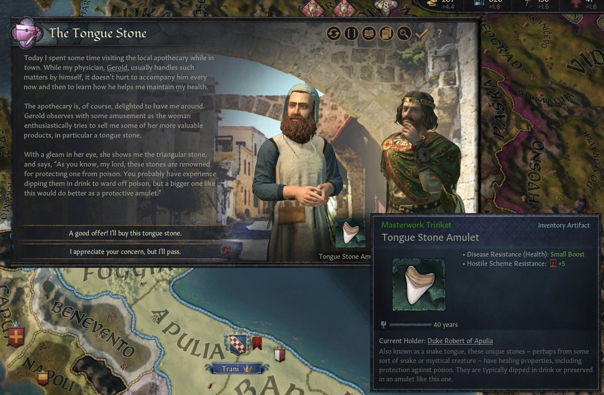 Персонаж посещает аптекаря, и тот пытается продать акулий зуб. Стоит артефакт не дорого и хотя бы благодаря эффекту плацебо реально может немного улучшить здоровье и даже сопротивление отравлению.