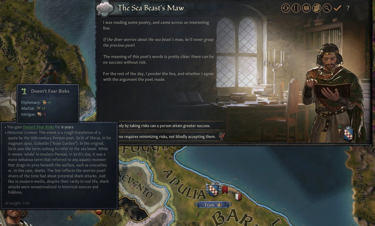 - Нужно больше рисковать - этот вывод повысит военное дело и дипломатический навык, но понизит интриганство на 6 лет;