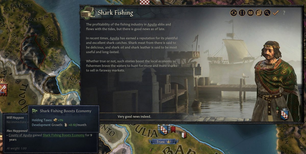 Рыболовство процветает, и в одном из графств люди успешно ловят акул. Это повышает налоговые поступления на 1% и на десятую процента скорость роста развития. Модификатор будет работать 9 лет.
