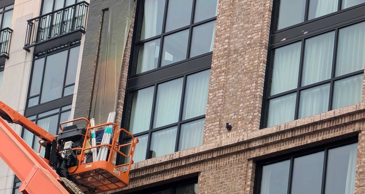 Хотя обычно такие муралы рисуют обычной краской, на этот раз дом просто оклеили специальной пленкой. Изображение состоит из множества полос, их удалось наклеить без заметных с земли швов.