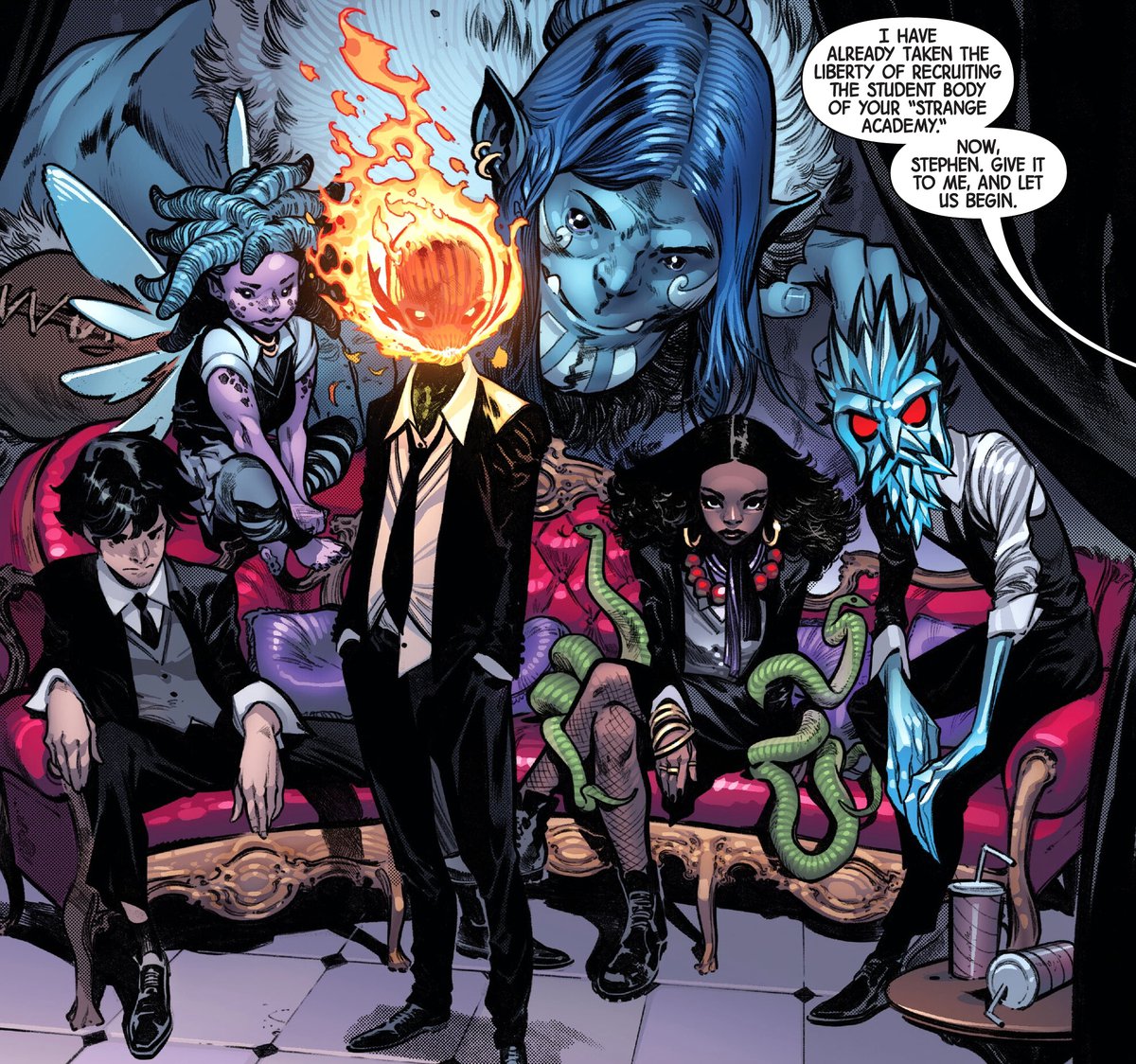 Земля всё ещё окутана пеленой тёмного измерения. Чтобы её развеять нужно провести мощный магический риуал для чего понадобится несколько волшебников. К счастью, такие имеются в Академии для юных колдунов имени Стрэнджа. К несчастью, пока они немного заняты. Об их приключениях рассказывается в серии Strange Academy: Blood Hunt, на этой неделе выйдет её финальный 3-ий выпуск. Пишет Дэниел Хосе Олдер, рисуют Луиджи Загария и Эрик Гапстур. Красит Эдгар Дельдаго.