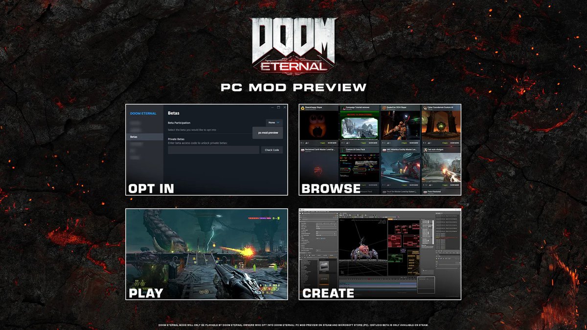 Сейчас idStudio и поддержка модификаций в Doom Eternal находятся на этапе бета-тестирования. Пока модификации доступны только на PC, для участия в тесте нужно загрузить специальную версию игры.