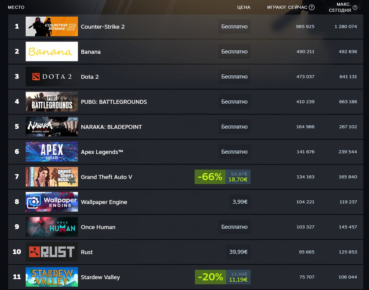 Интересный момент: по какой-то причине бенчмарк Black Myth Wukong не показывается в общем топе Steam. Если бы бенчмарк отображался в списке, то занимал бы 11 место — между Rust и War Thunder.