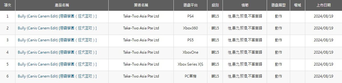 По данным базы тайваньского рейтингового агентства невозможно сказать, зачем Bully обновляли возрастной рейтинг. Примечательно, что у игры отсутствует полноценная версия и для современных консолей, и для устройств предыдуущего поколения.