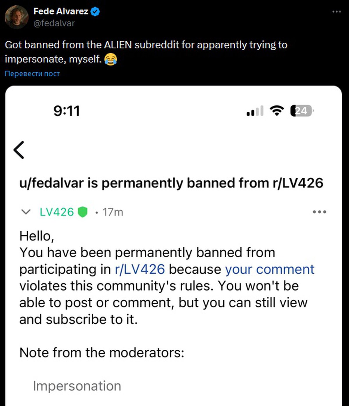 Меня забанили в сабреддите «Чужого» за попытку выдать себя за себя же.
