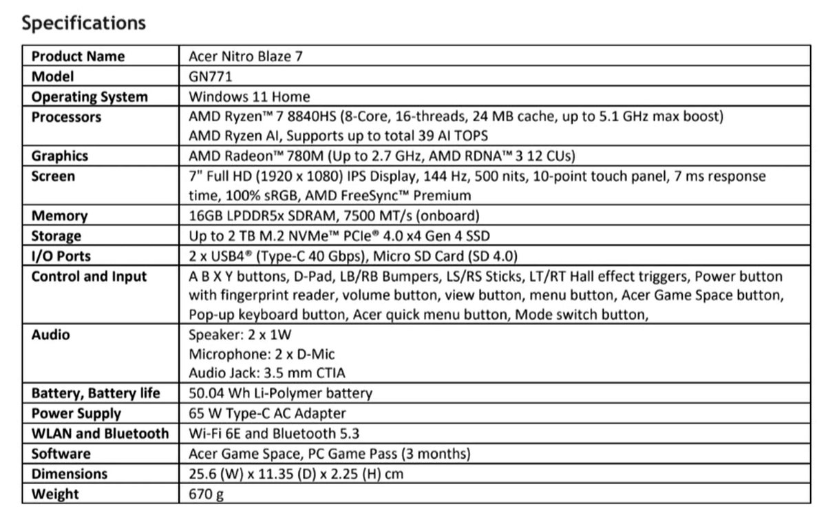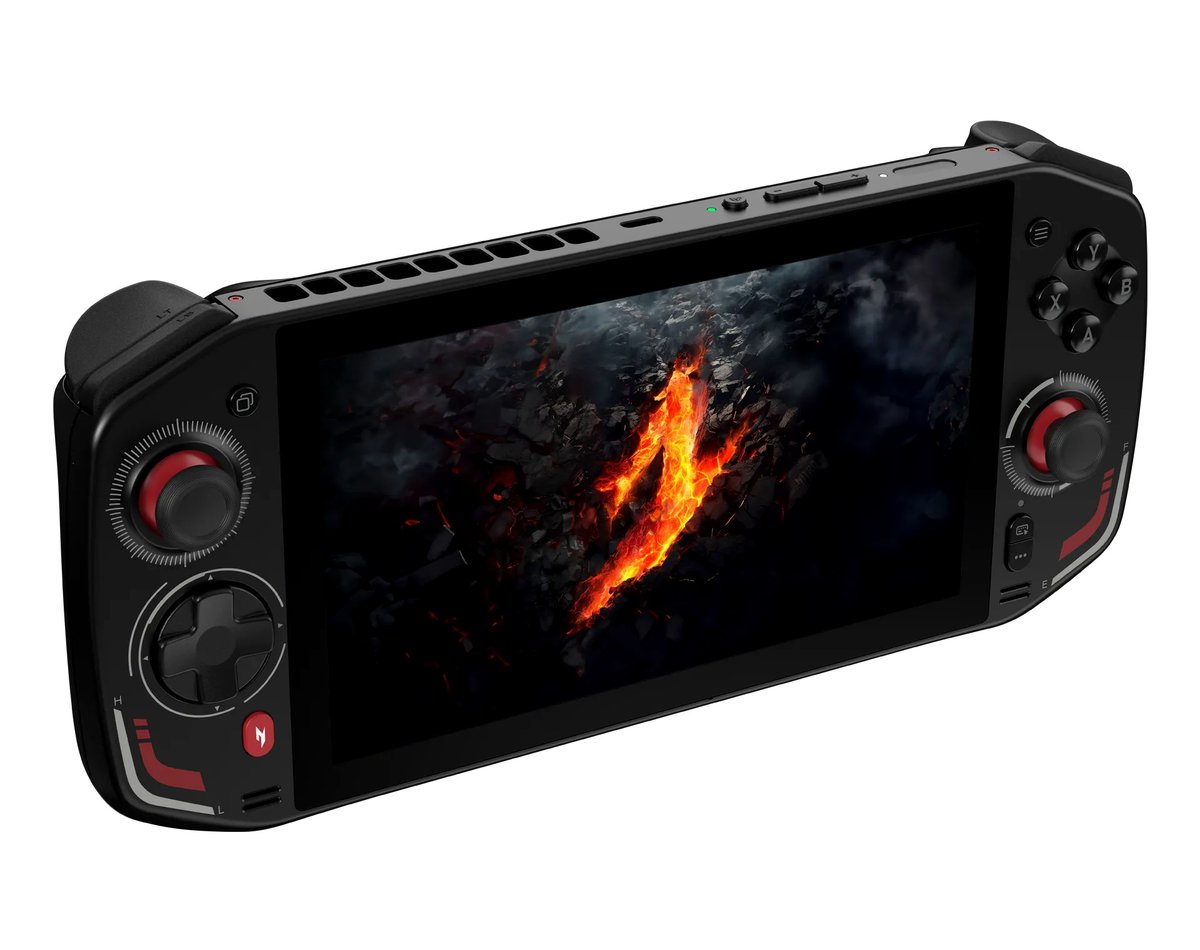 Acer Nitro Blaze 7 работает под управлением Windows 11 и получит специальную оболочку Acer Game Space. Схема управления выглядит стандартной: есть два стика, набор кнопок и сенсорный экран с разрешением 1080p.