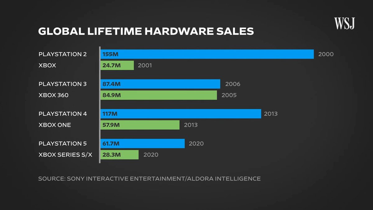 Примечательно, что примерно таким же было соотношение продаж Xbox и PlayStation в предыдущем поколении. Тогда PlayStation 4 (117 миллионов проданных консолей) обошла Xbox One (57.9 миллиона проданных консолей) в два с небольшим раза.