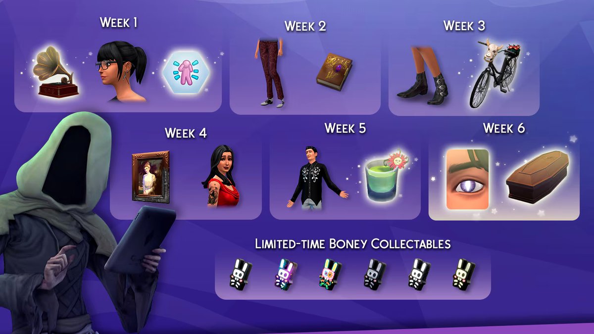 Неделя 1: Призовите Смерть с помощью граммофона «В шаге от Смерти» и слушайте любимые мелодии! Пощеголяйте новыми серьгами «Неминуемая гибель» и напугайте персонажей в новом испытании на участке «Тяга к ужасам».
