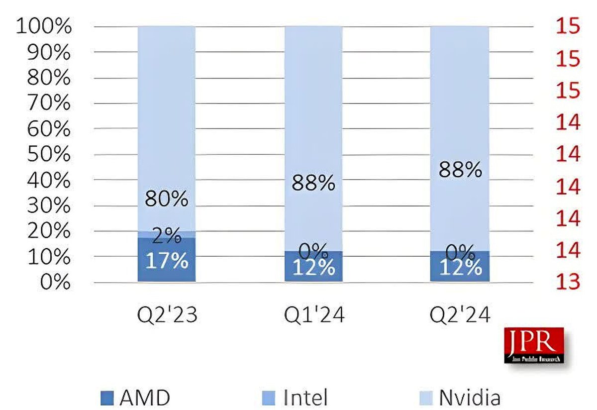 Лидером все еще остается Nvidia: она контролирует примерно 88% рынка. У AMD второе место, ее Radeon принадлежит около 12% рынка.