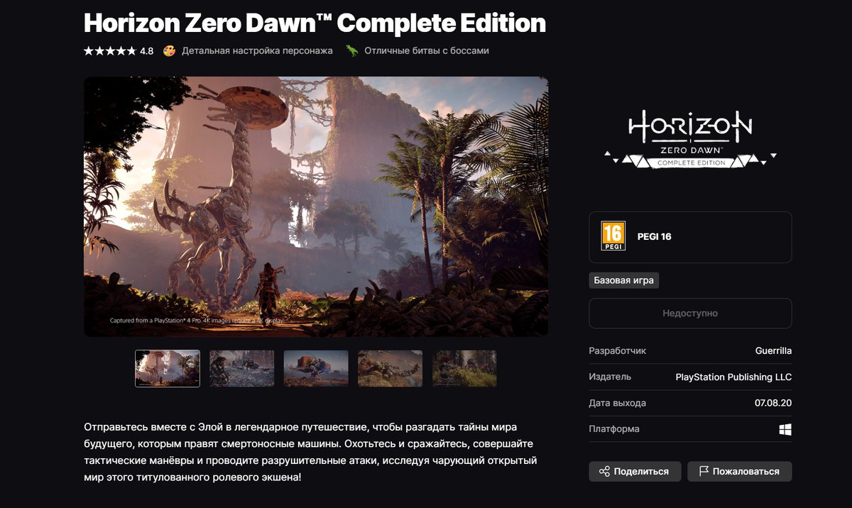 Магазин Epic Games Store прекратил продажу полного издания Horizon Zero Dawn. Страница проекта осталась в магазине, но купить игру невозможно, цена не отображается: Horizon Zero Dawn Complete Edition помечена как недоступная для продажи.