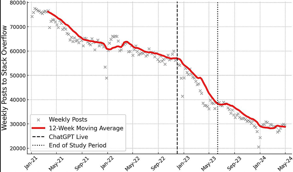 Согласно подсчетам авторов исследования, в течение полугода после запуска ChatGPT число вопросов на Stack Overflow, публикуемых еженедельно, упало примерно на 25%. Падение более-менее замедлилось только в начале 2024 года.
