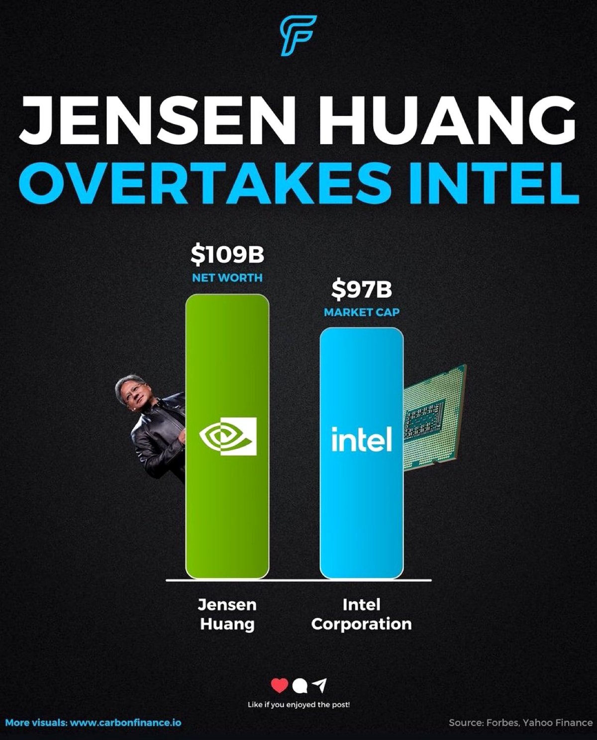Благодаря росту стоимости акций Nvidia состояние основателя и руководителя компании Хуана Жэньсюня превысило $109 миллиардов. Энтузиасты быстро заметили, что это больше, чем капитализация корпорации Intel.