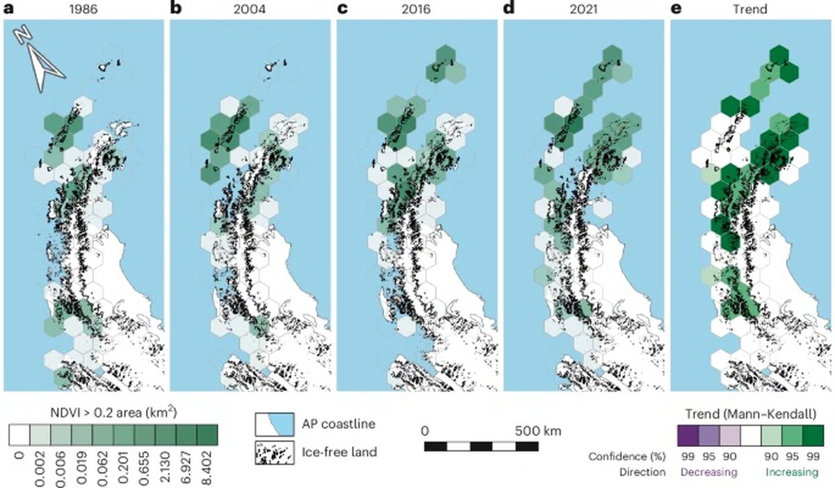 В начале наблюдения за Антарктикой из космоса площадь участков, покрытых растительностью, не превышала 0.863 квадратных километров. Сейчас зелень может покрывать без малого 12 квадратных километров Антарктики.