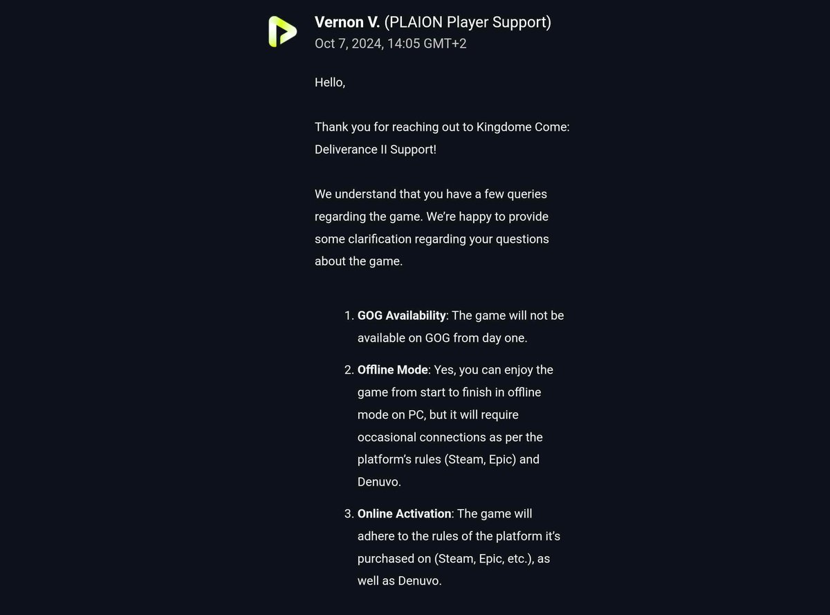 Если ответ техподдержки соответствует действительности, то Kingdom Come Deliverance 2 можно будет пройти в офлайн-режиме, но подключение к сети потребуется для работы DRM-систем Steam и Epic Games Store, а также для подключения к серверам Denuvo.