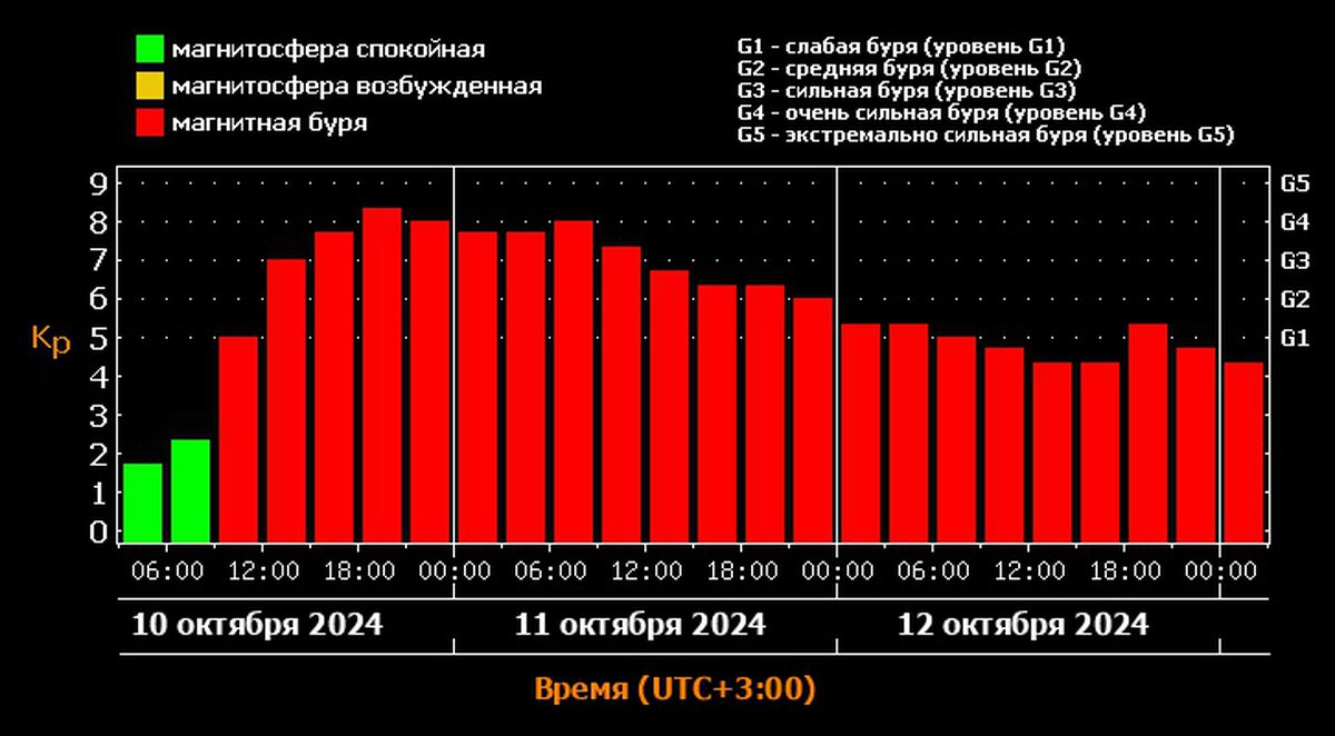 Согласно прогнозу Лаборатории солнечной астрономии ИКИ и ИСЭФ, магнитная буря выйдет на пик вечером 10 октября и будет находиться примерно на этом уровне почти до середины дня 11 октября.
