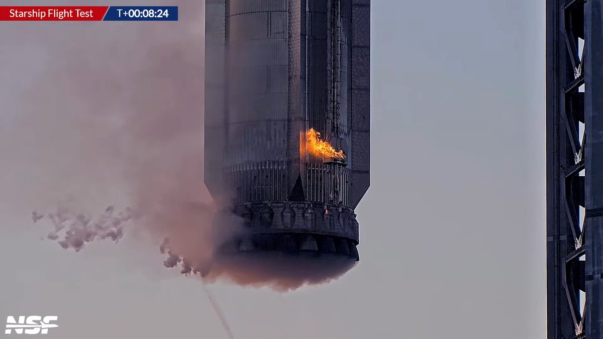 В SpaceX пока не говорили, насколько нормально прошла посадка Super Heavy, первой ступени Starship. Некоторое время после посадки в нижней части ускорителя виднелось пламя, из зоны двигателей время от времени падало что-то вроде горящих кабелей.