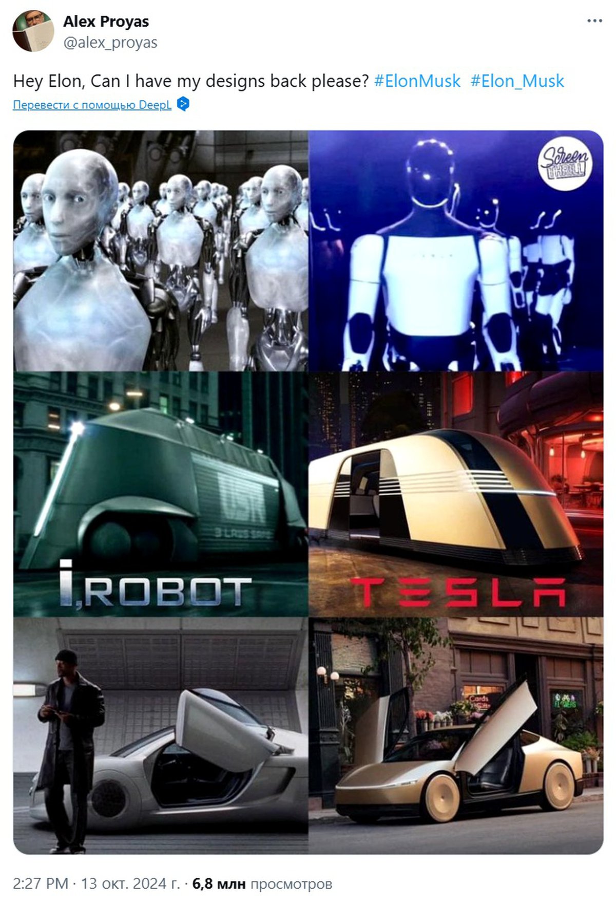 «Эй, Илон, можно вернуть мне мои дизайны?», спросил Пройас и приложил изображение, на котором показаны машины и роботы из фильма и с презентации «We, Robot».
