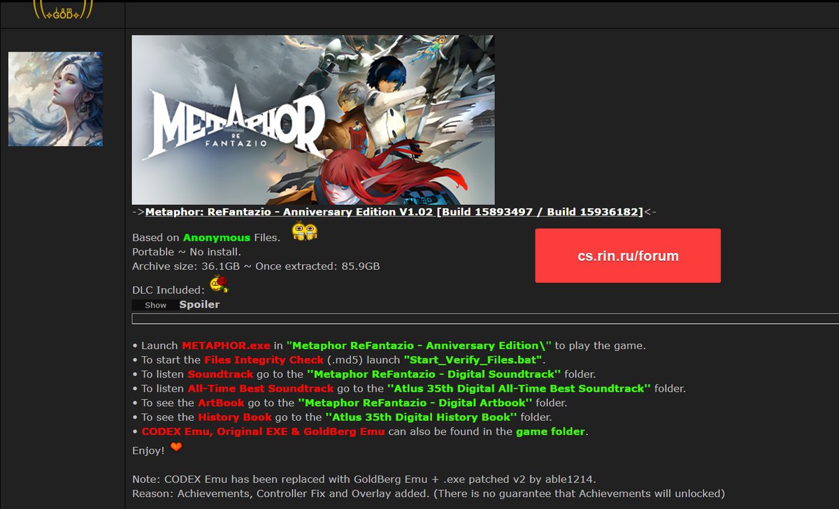 Metaphor ReFantazio, новую игру Atlus, удалось взломать на ПК. Игра защищена антипиратской системой Denuvo, но ее не потребовалось обходить для взлома.