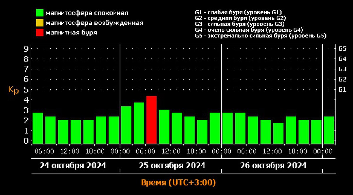 Впрочем, в ближайшие пару дней такая буря не ожидается. Согласно данным Лаборатории солнечной астрономии ИКИ и ИСЭФ, сильных магнитных бурь не будет как минимум до конца 26 октября.