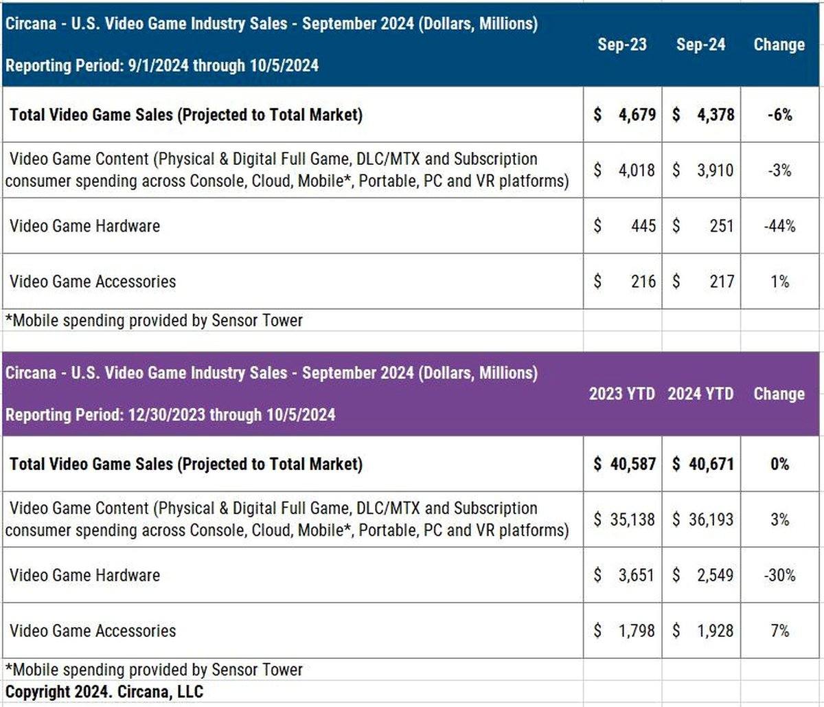За 9 месяцев 2024 год американские игроки потратили на покупку консолей $2.5 миллиарда — на 30% меньше, чем за тот же период 2023 года. Благодаря росту продаж аксессуаров и игр общая выручка почти не поменялась: $40.671 миллиарда против $40.587 миллиарда.