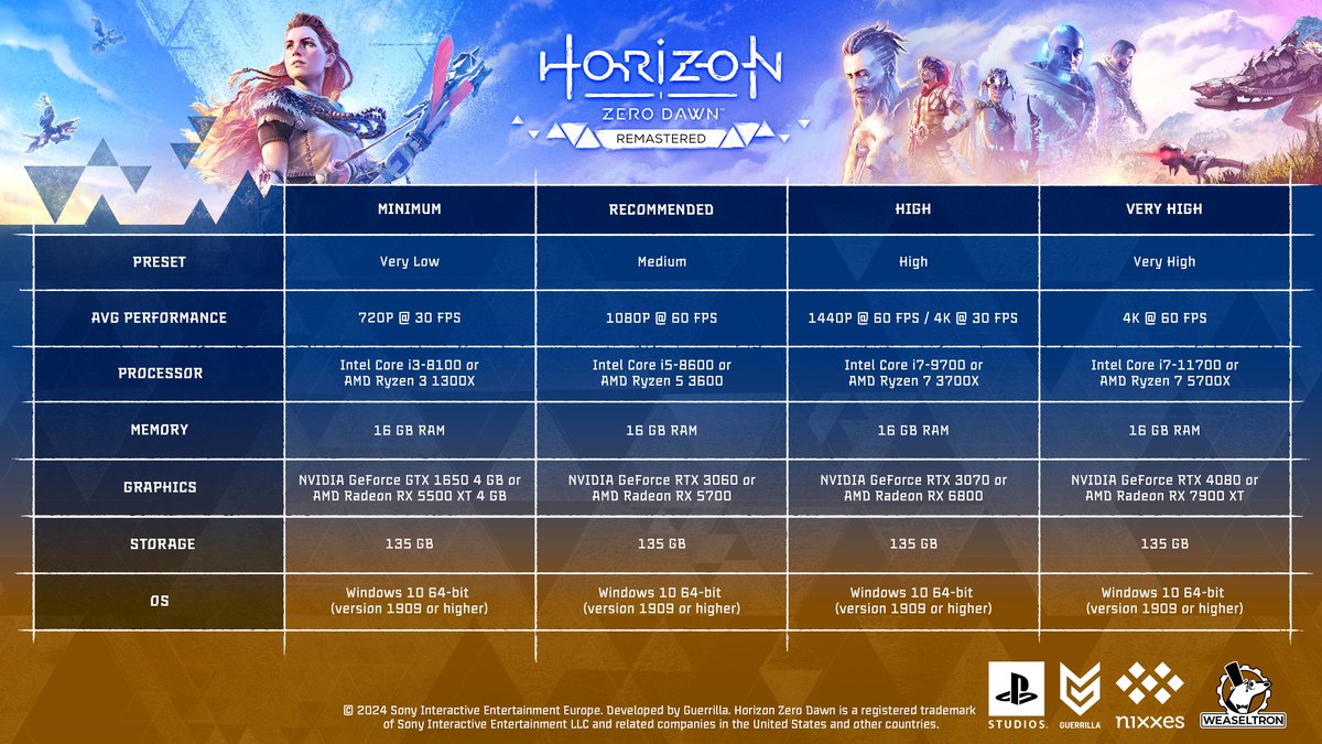 Интересный момент: если не считать места на накопителе, то системные требования ремастера Horizon Zero Dawn в точности повторяют требования Horizon Forbidden West, второй части серии.