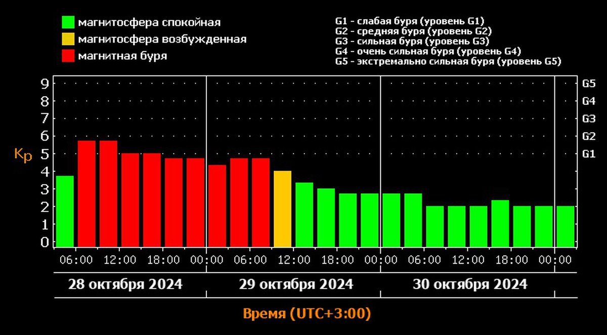 28 октября в районе полудня по Москве буря была особенно сильной и приближалась к классу G2. Затем она немного ослабела, но ученые ожидают, что сила магнитной бури будет соответствовать классу G1 как минимум до 9-10 утра 29 октября.