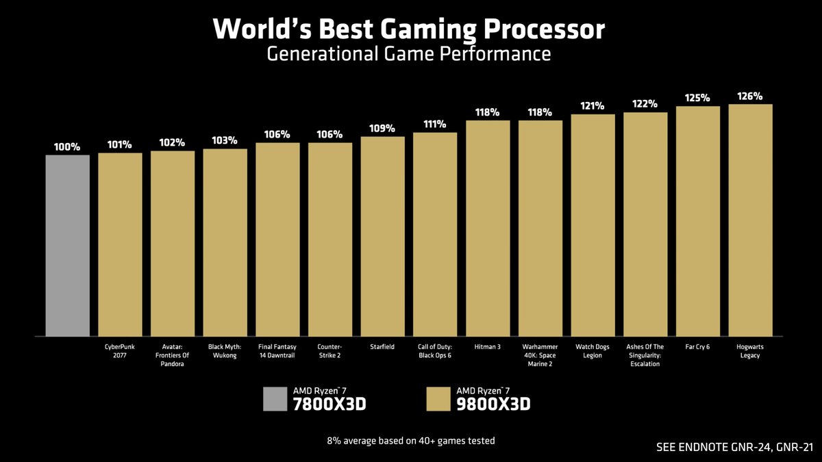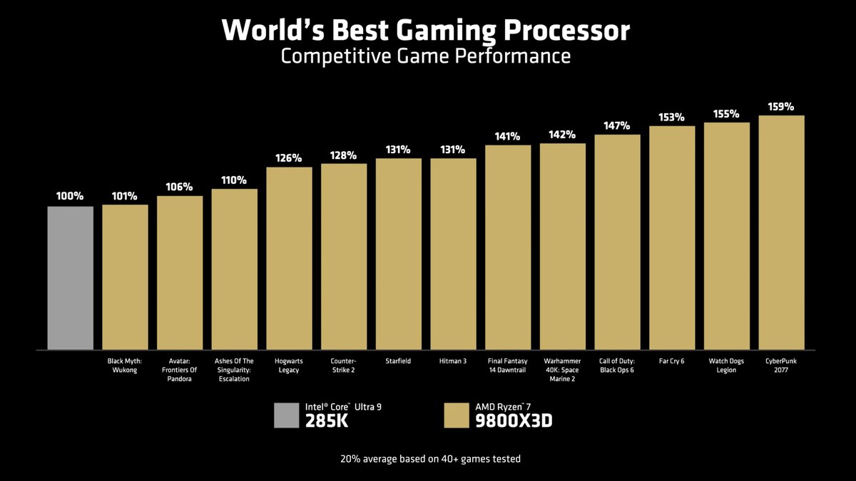 Одновременно с анонсом AMD распространила несколько бенчмарков Ryzen 7 9800X3D. Измерения производились сотрудниками компании, процессор сравнивали с Intel Core Ultra 9 285K и Ryzen 7 7800X3D в десятках игр.