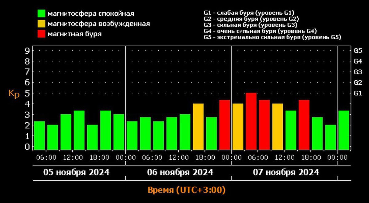 Сама магнитная буря растянется на большую часть 7 ноября. Последний пик бури будет в районе 18:00 по Москве, затем состояние магнитосферы Земли стабилизируется.