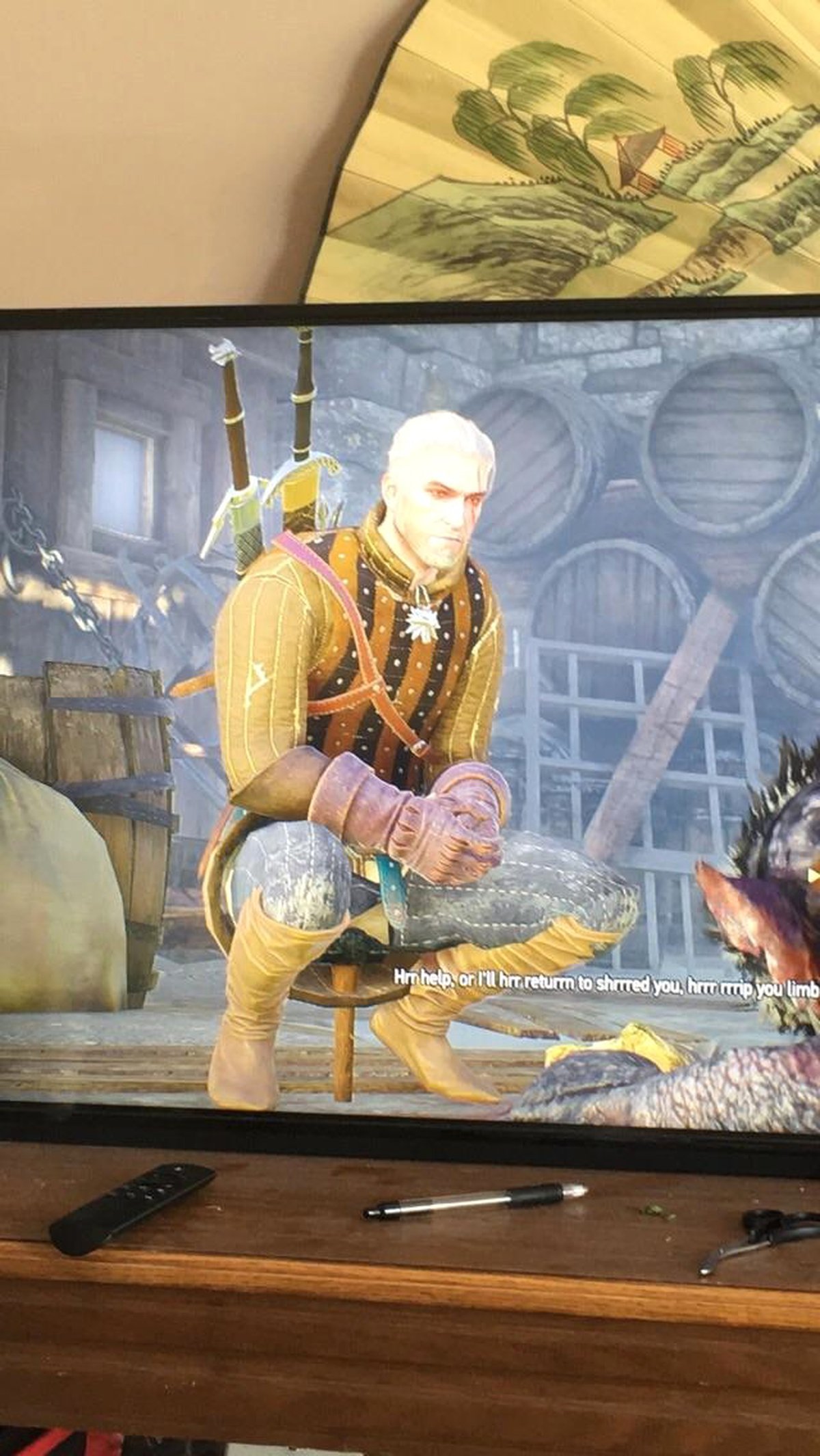 Битва с рядовым утопцем? Молоток здесь. Серьезный разговор с императором? Молоток рядом. Финальное противостояние с Дикой охотой? Все верно. Даже во время откровенных катсцен между ног Геральта именно молоток. И в других катсценах тоже.
