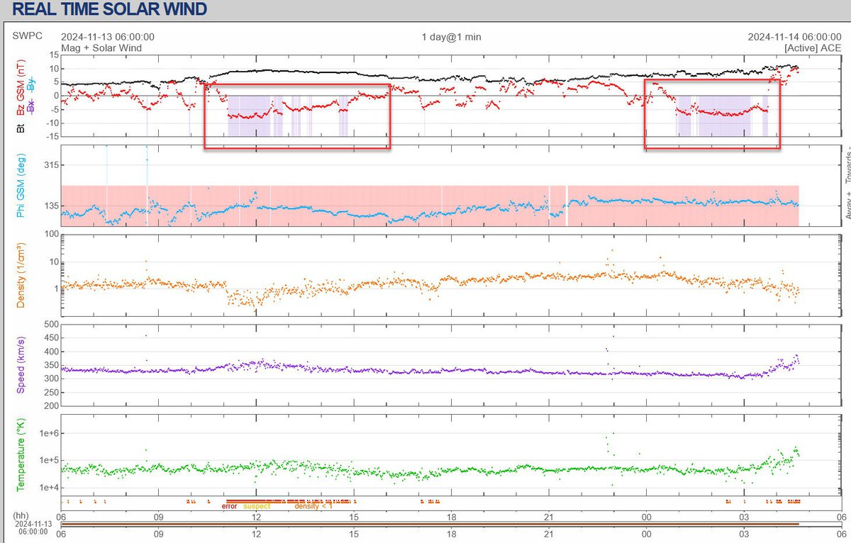 В потоке солнечного ветра, добравшегося до Земли, если магнитные поля, направленные на юг. Они будут взаимодействовать с магнитным полем планеты, направленным на север, и частично его нейтрализуют.