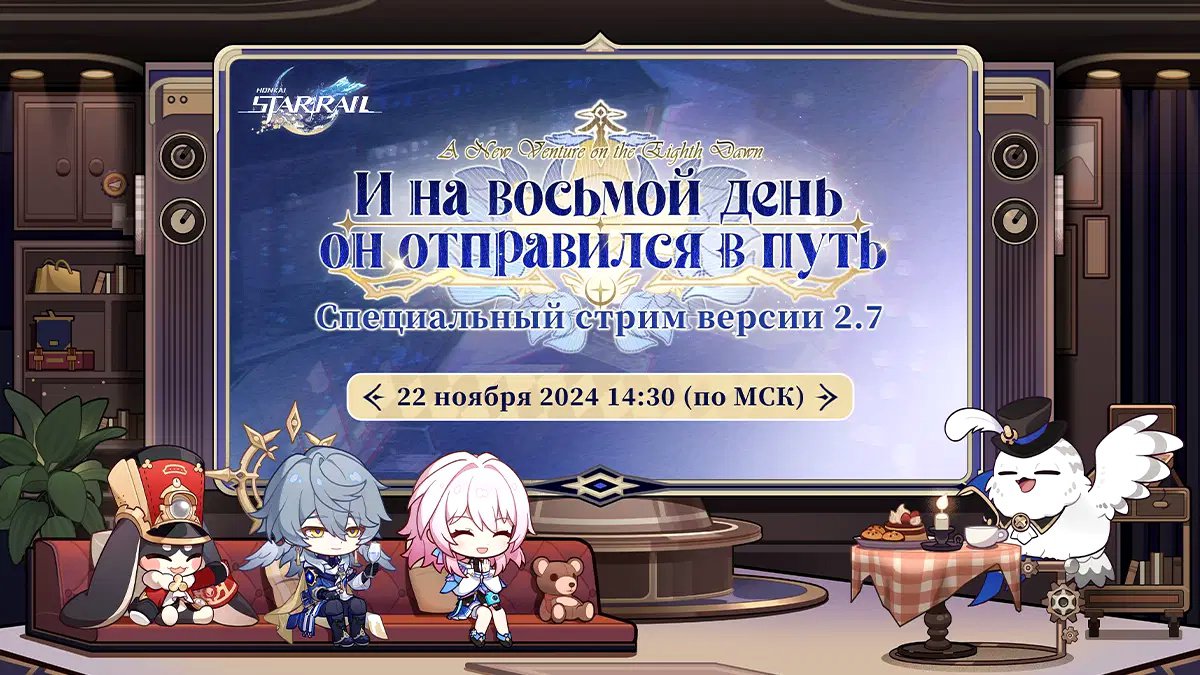 Студия miHoYo анонсировала трансляцию, посвященную обновлению 2.7 для Honkai Star Rail — патч назвали «И на восьмой день он отправился в путь». Стрим состоится 22 ноября, трансляция стартует в 14:30 по Москве.