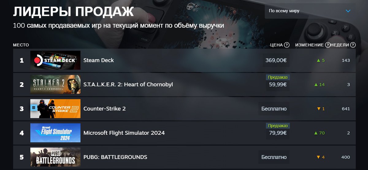 Формально первое место по продажам все еще у портативной консоли Steam Deck, также продающейся через Steam. При составлении топа учитывается не число проданных копий, а выручка — именно поэтому в чарте есть бесплатные игры.