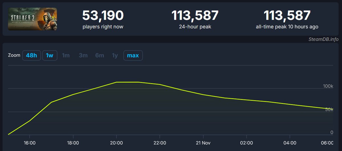 Сам старт S.T.A.L.K.E.R. 2 в Steam оказался скромнее, чем можно было ожидать. Вечером в день релиза в игре одновременно находилось 113 тысяч человек, по этому показателю S.T.A.L.K.E.R. 2 была ниже Grand Theft Auto V и Wallpaper Engine, но выше Rust и Throne and Liberty.