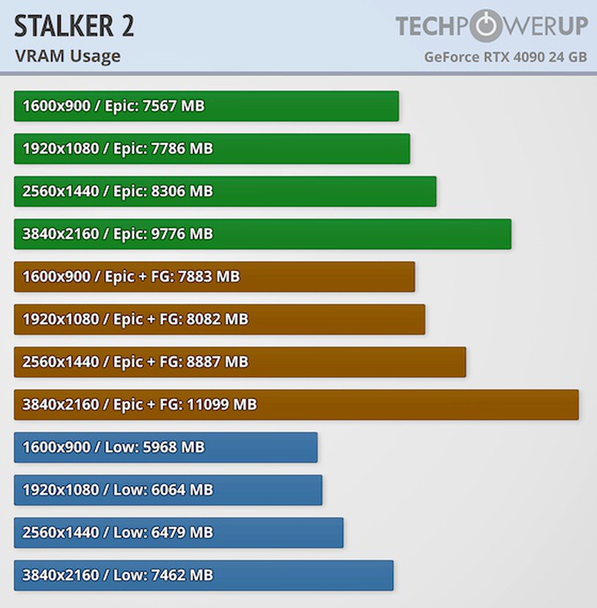 Заодно выяснилось, сколько именно видеопамяти нужно игре при работе на самых низких и самых высоких настройках. Если не активировать генерацию кадров, то разница будет в пределах пары гигабайт, с генерацией памяти нужно заметно больше.