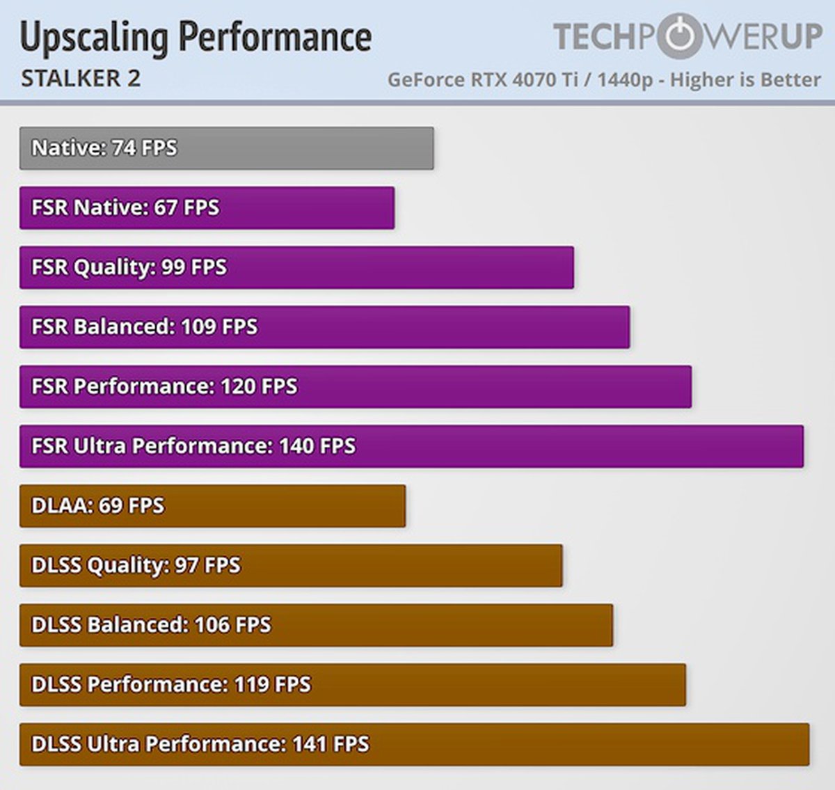 Кроме того, была протестирована частота кадров при использовании двух апскейлов, интегрированных в S.T.A.L.K.E.R. 2: FSR 3 и DLSS 3. Разница оказалась минимальна: иногда DLSS чуть быстрее, иногда FSR его обходит.