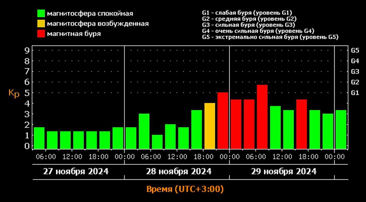 Буря будет продолжаться всю ночь и все утро 29 ноября. После 6 часов утра 29 ноября магнитная буря усилится и достигнет класса G2, но затем магнитосфера достаточно быстро успокоится. Правда, ожидается повторный пик вечером 29 ноября, но он будет коротким.