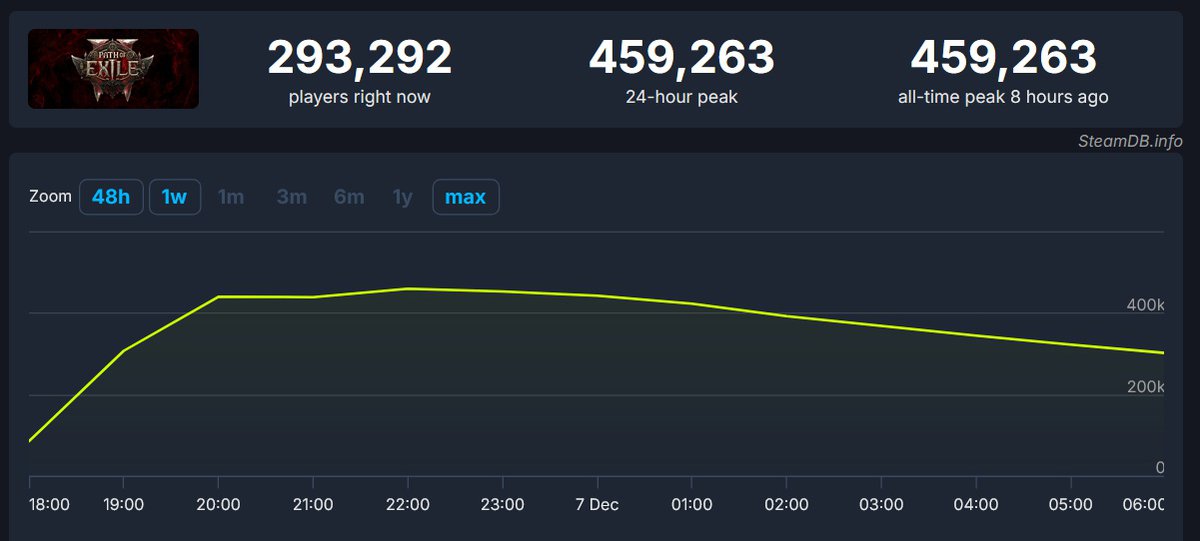 Уже через несколько часов после выхода онлайн в Steam-версии Path of Exile 2 превысил 459 тысяч человек. Это примерно вдвое выше пикового показателя первой части серии: в Path of Exile максимум играло 229 тысяч человек.