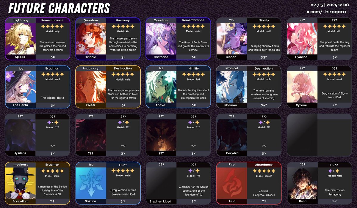 Благодаря информации Seele Leaks художнику Hiragara удалось собрать инфографику, посвященную новым персонажам Honkai Star Rail. Сюда попали не только герои из ближайших обновлений, но и персонажи, которые появятся в игре позднее.