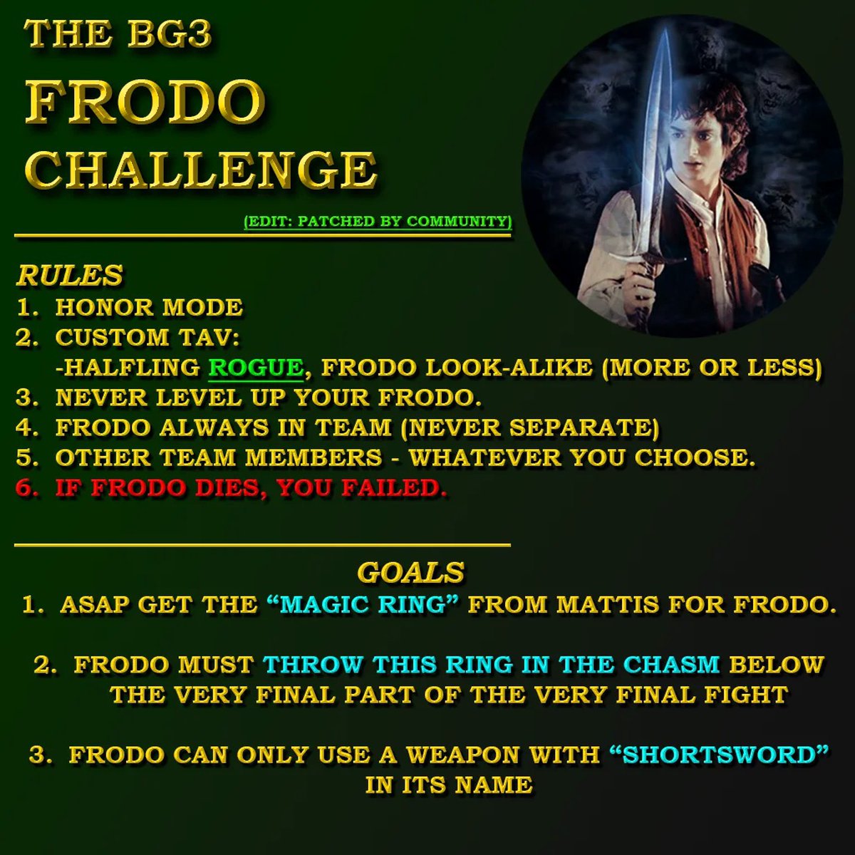 Некоторые фанаты считают, что челлендж необходимо усложнить, добавив в него игровую версию Сэма. Это должен быть полурослик с мультиклассом (Сэм — очень способный парень), вместе с которым наш «Фродо» должен одолеть большую часть игры.