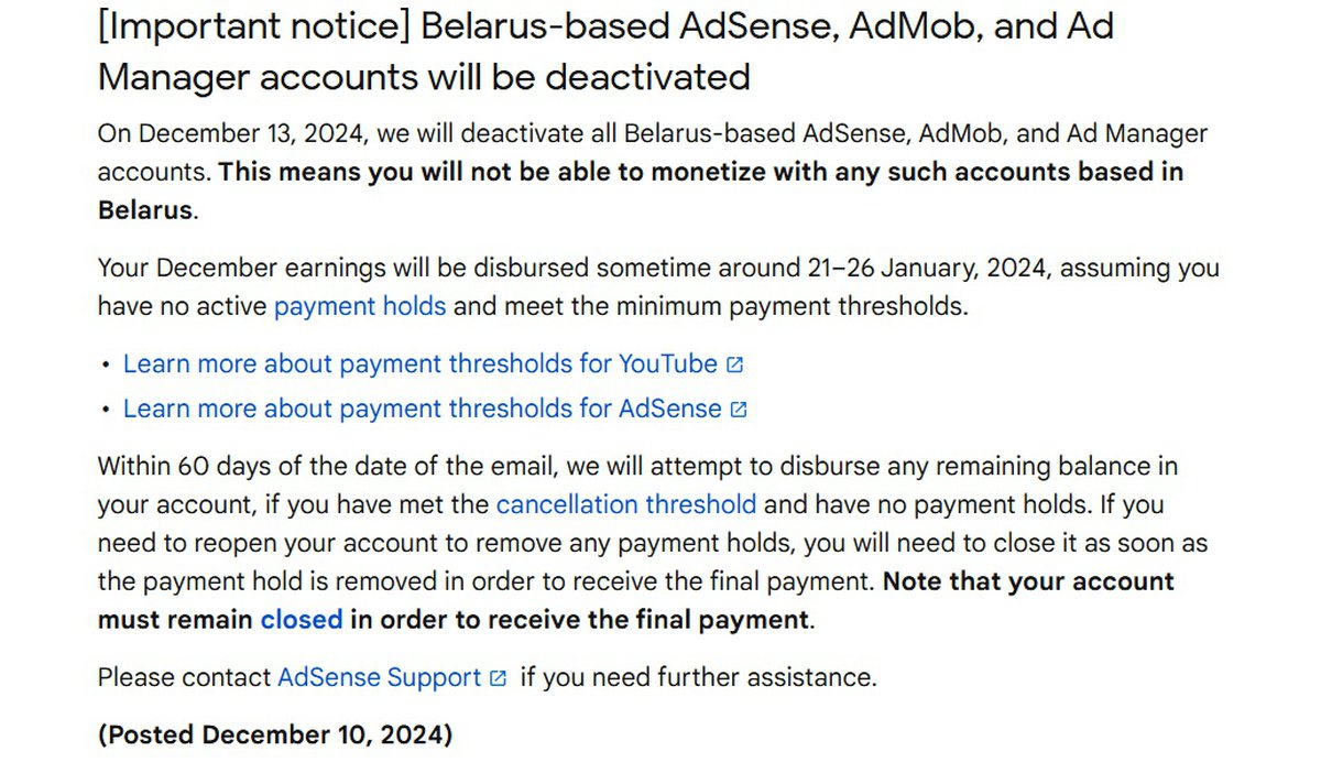 Корпорация Google намерена закрыть жителям Беларуси доступ к своим рекламным сервисам AdSense, AdMob и Ad Manager. Уже 13 декабря 2024 года белорусские аккаунты в этих сервисах будут деактивированы.