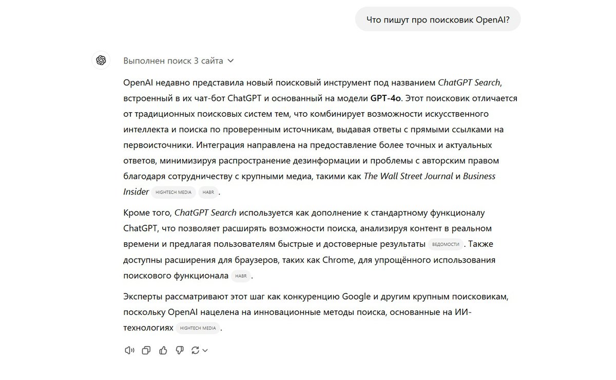 Одновременно компания повысила качество своего поискового движка и увеличила скорость его работы. Кроме того, поисковик в ChatGPT разрешили использовать не только в текстовом, но и в голосовом режиме.