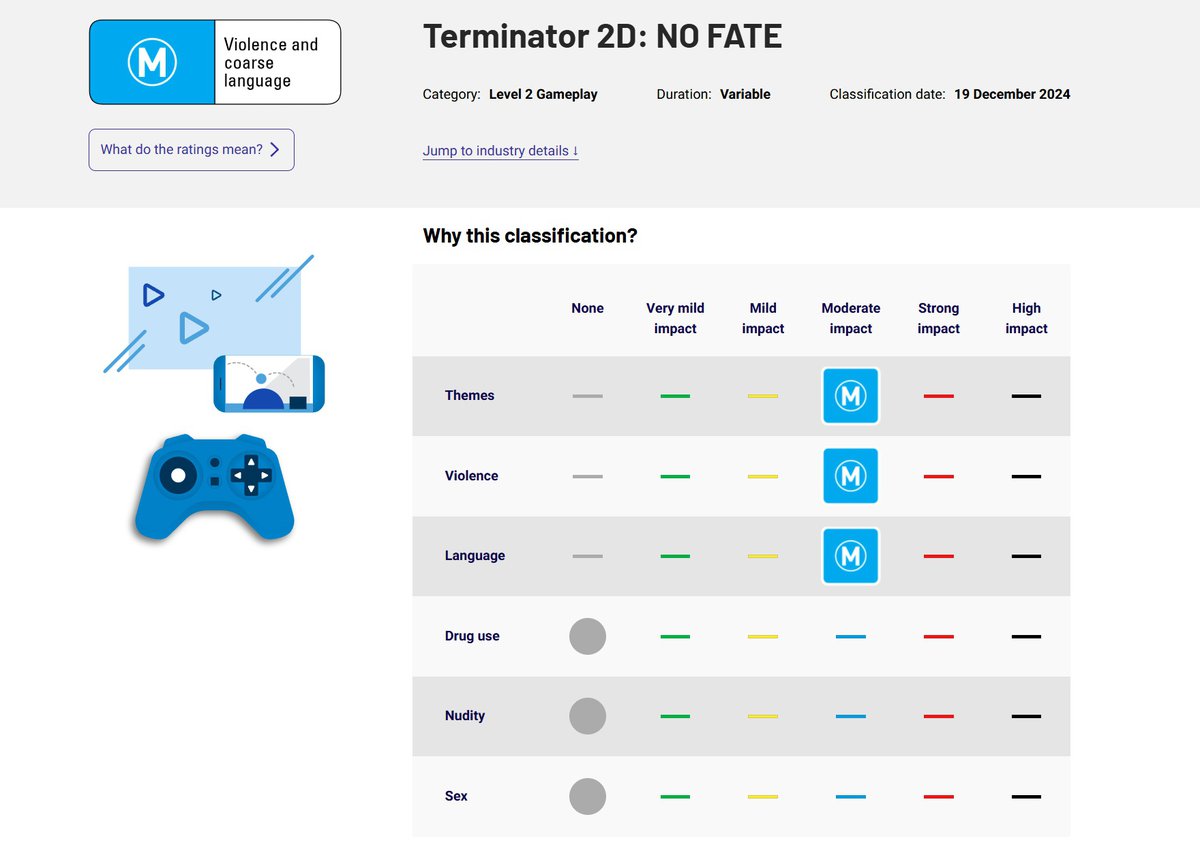 Terminator 2D No Fate получила возрастной рейтинг M: игроки столкнутся с взрослыми темами, насилием и руганью. Какие-либо подробности игры не приводятся.