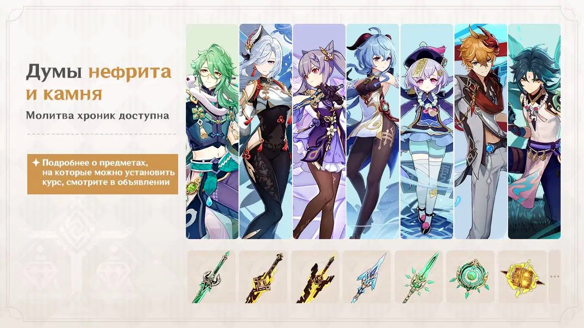 - Персонажи 5★: Бай Чжу, Шэнь Хэ, Кэ Цин, Гань Юй, Ци Ци, Тарталья и Сяо.