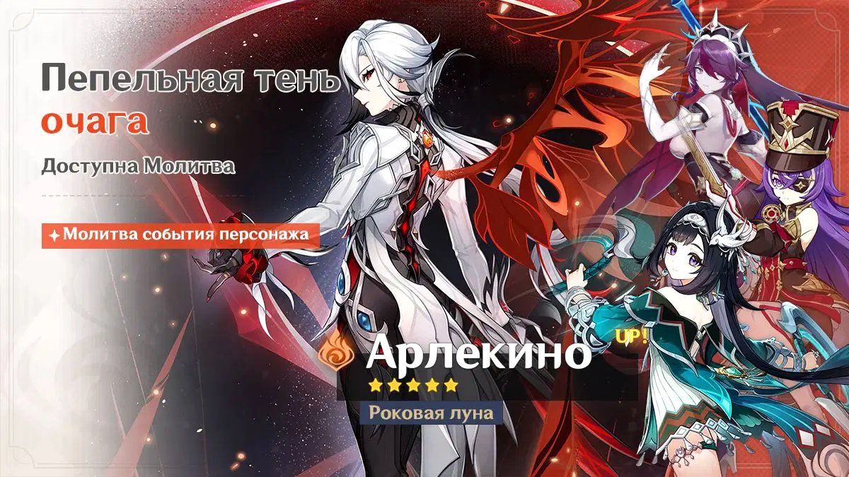- Арлекино: реран, 5 звезд редкости, пиро, древковое.