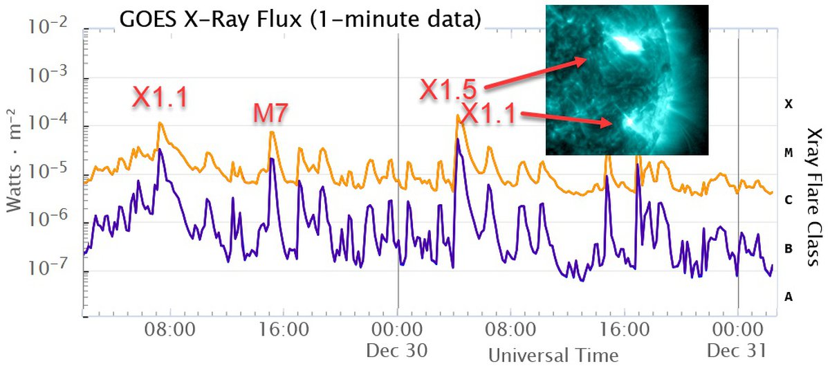 Три зафиксированных вспышки относятся к максимальному классу X, еще десяток — к предмаксимальному классу M, остальные вспышки слабее. Оценить количество вспышек проще всего на графике ниже — по характерным пикам.