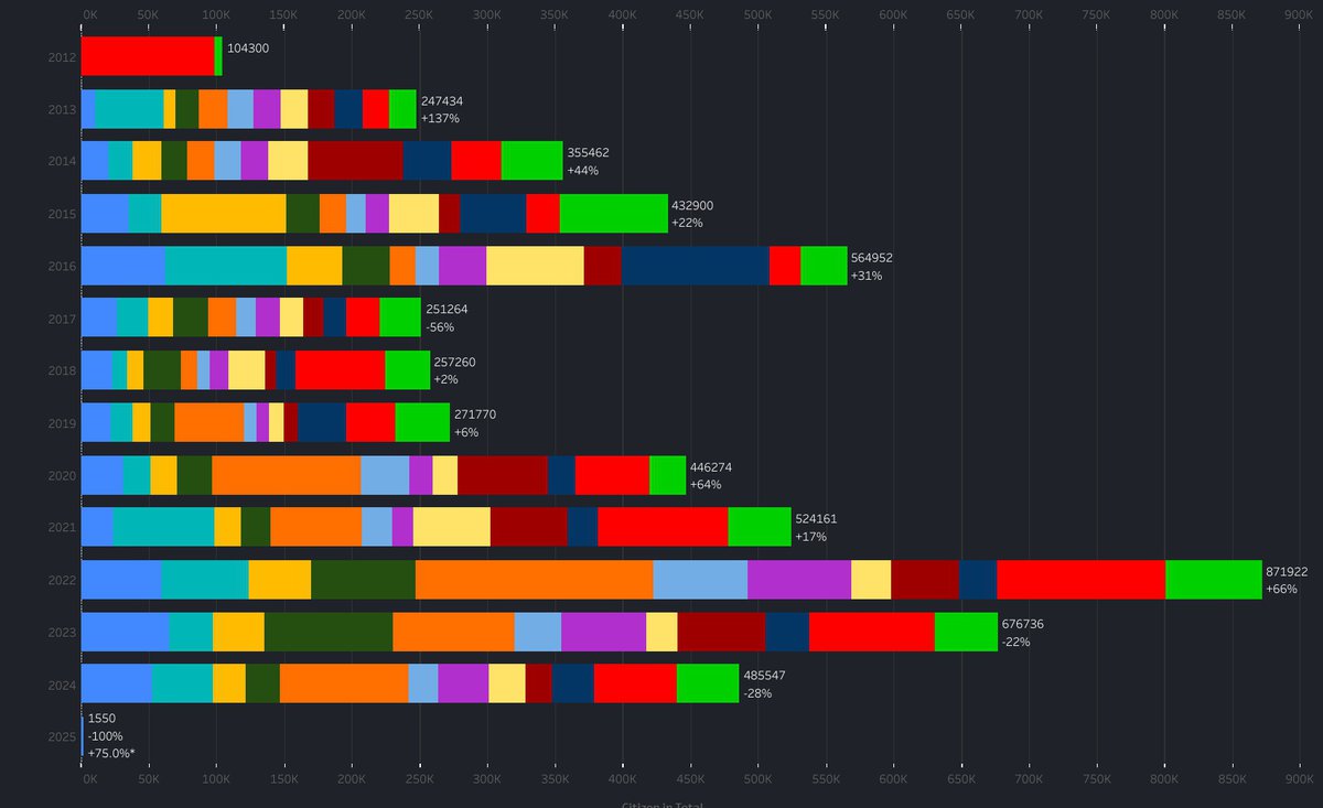 Примечательно, что скорость привлечения новых игроков сильно замедлилась. В 2022 году Star Citizen привлекла 871 тысячу игроков, в 2024 году этот показатель упал до 485 тысяч — это ниже, чем в 2021 году.
