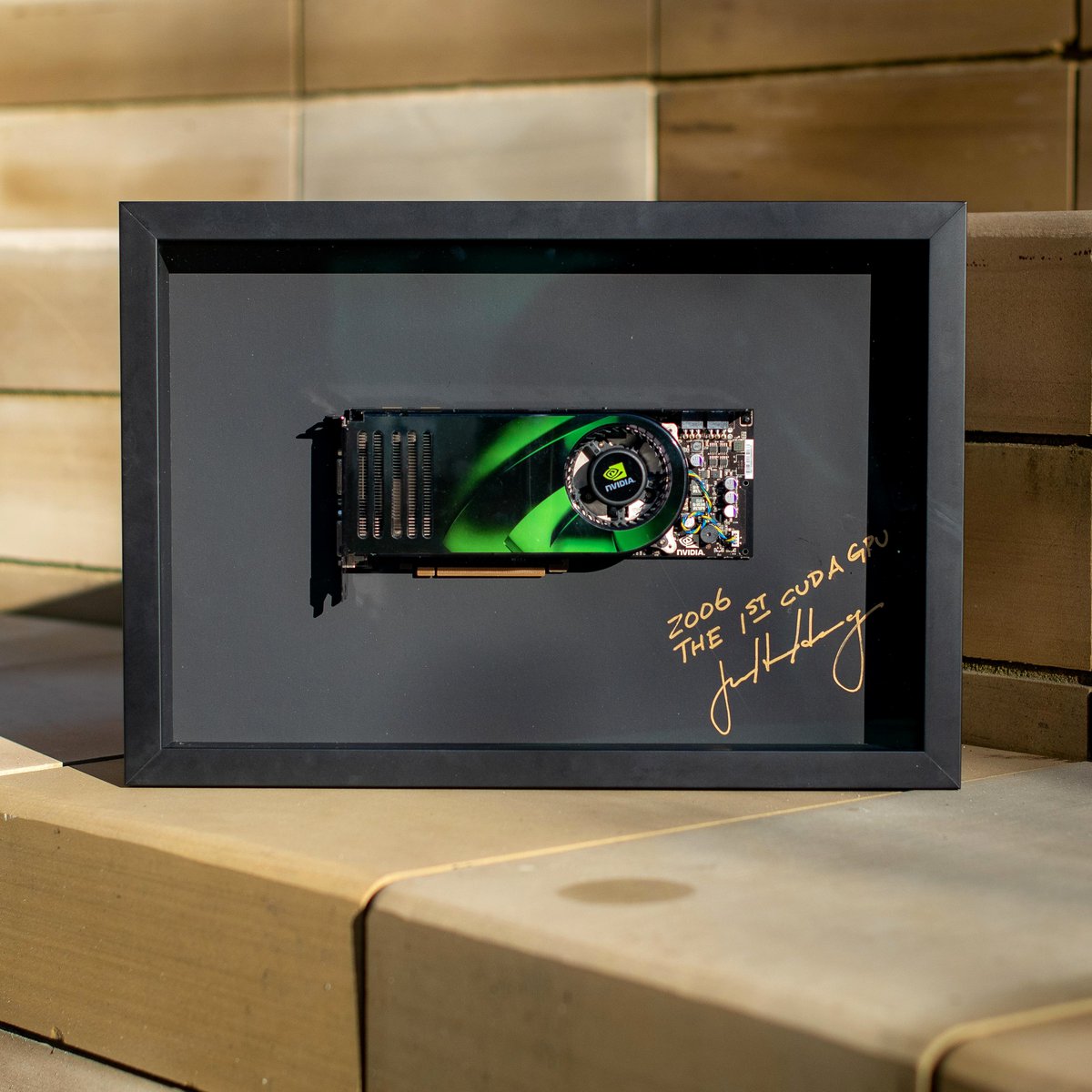 Пока компания раскрыла две подарочных видеокарты из пяти. Все карты заключены в рамочки и снабжены автографами Хуана Жэньсюня, основателя и руководителя Nvidia.